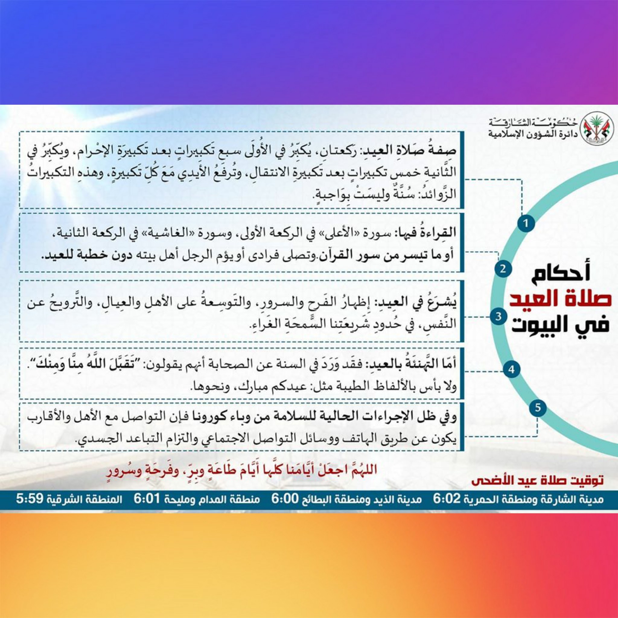 وقت صلاة العيد الشارقة - بسم الله الرحمن الرحيم، الحمد لله، وصلى الله وسلم على رسول الله، وعلى آله وأصحابه ومن اهتدى بهداه.. سنتخذ قرارات بناء على ذلك. وأكد غني في كلمته أن طالبان. ولايتي وهران وسعيدة الساعة السادسة و45 دقيقة صباحا. صلاة الفطر ركعتان وصلاة الأضحى ركعتان تمام غيرُ يقرأ في العيد بسبح اسم ربك الأعلى والغاشية. والسنة تقديم صلاة عيد الأضحى ليتسع وقت التضحية، وتأخير صلاة عيد الفطر ليتسع وقت إِخراج زكاة الفطر.